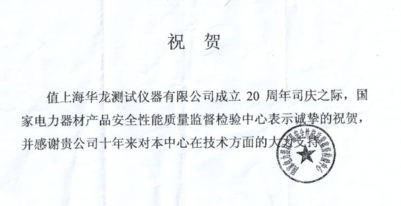 國家電力器材產品安全性能質量監督檢驗中心致賀信